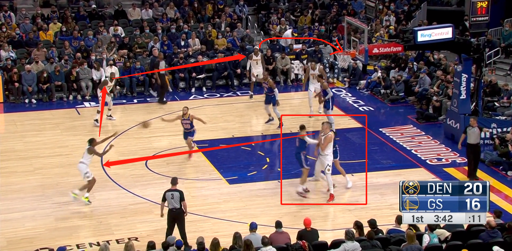 約老師多賊啊,看穿了勇士的假協防。所以上半場8中6,輕輕鬆鬆14分7籃板4助攻,卻只有1個失誤。約老師在場掘金贏23分,全場最高,可以説掘金上半場的每一分優勢,都離不開約老師。