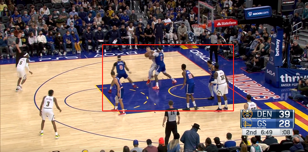 勇士不敢。上半場只要約老師在低位接球,勇士看起來是極其嚇人的全部收縮,但所有收到禁區的都是假協防。因為真的夾擊一到,約老師傳到外線就是空位三分。