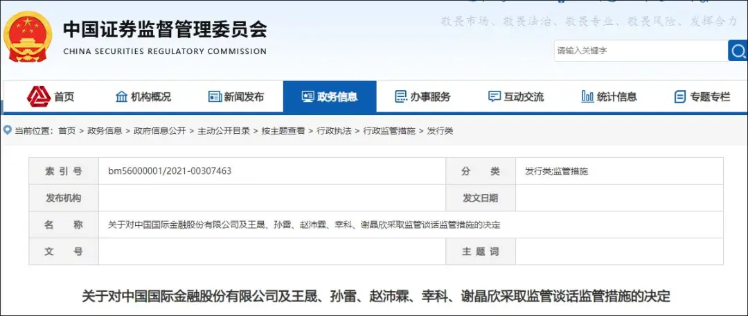 據證監會網站消息,證監會12月20日發佈關於對中國國際金融股份有限公司及王晟、孫雷、趙沛霖、幸科、謝晶欣**採取監管談話監管措施的決定。**全文如下: