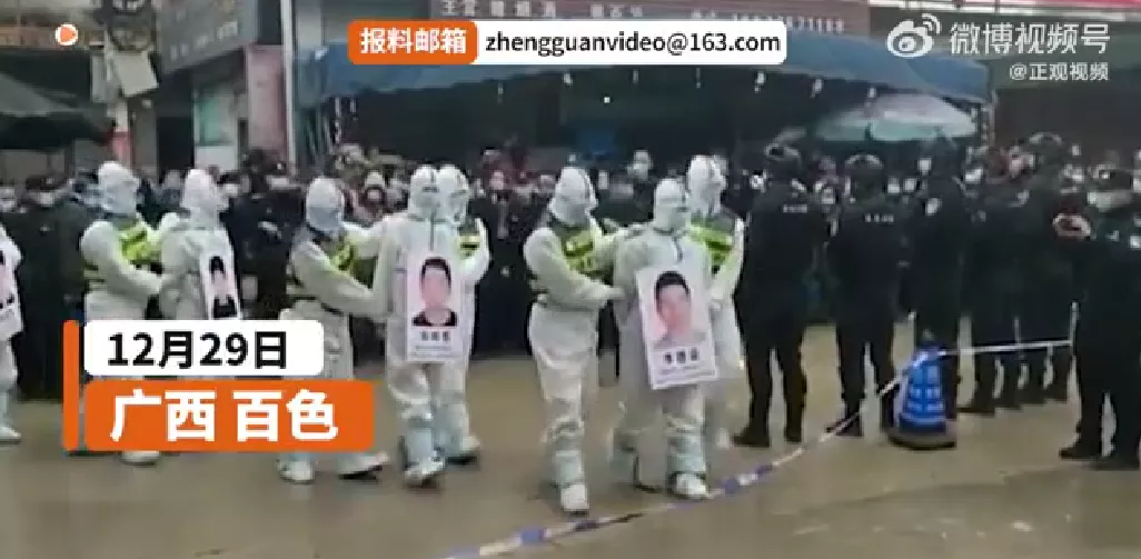 **據@正觀新聞 消息,12月29日,廣西百色。一段4人被押解“遊街示眾”的視頻廣為流傳,**視頻中幾人身穿防護服,胸前和後背掛有大幅照片。
