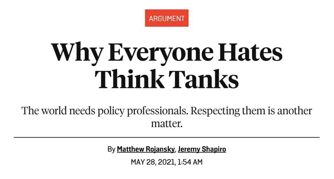 **文章原載《外交政策》(Foreign Policy),轉自“法意觀天下”,原題為《為什麼所有人都討厭智庫》,**僅代表作者觀點,供讀者思考。