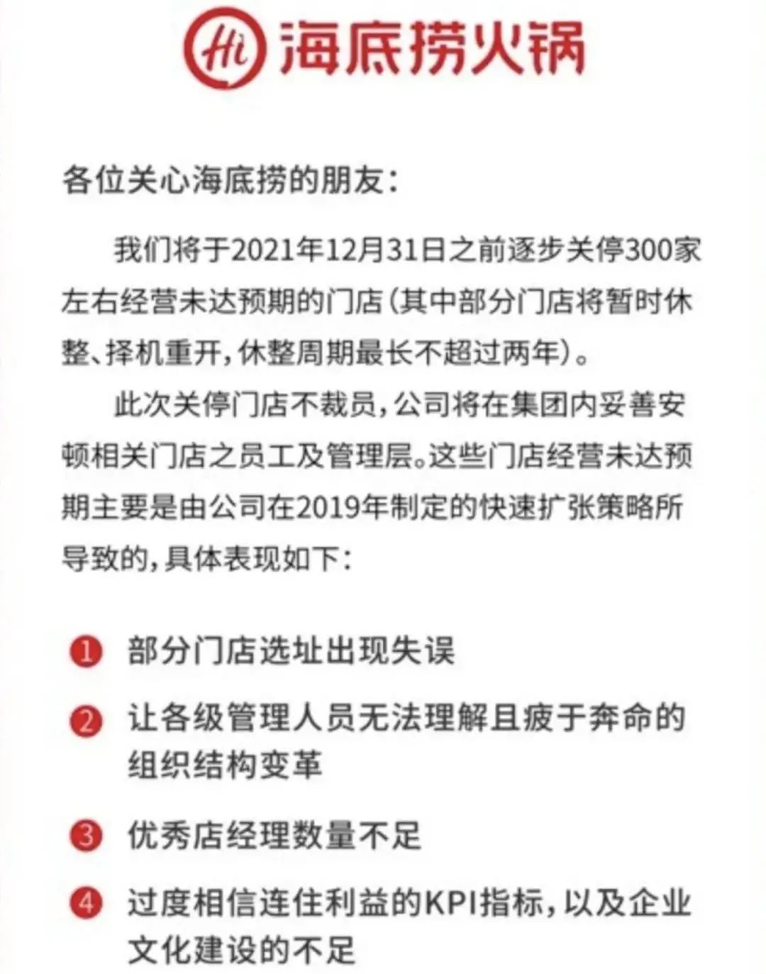2021年2月,海底撈的股價一度高達85.75港元,最高市值4544.75億港元,時至6月,股價出現斷崖式下跌,市值蒸發超2500億港元。11月,海底撈宣佈關閉300家門店,令外界譁然。