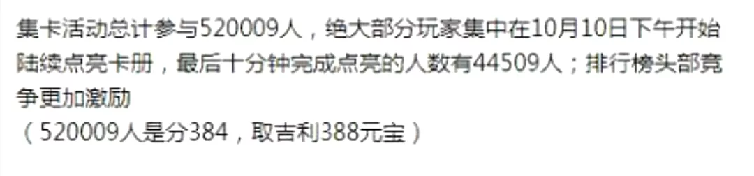 十週年版《三國殺》在開服之初搞了一個集卡瓜分2億元寶的活動,那時候去新服的玩家還不是很多,活動截止的前一天下午也只有10000多人完成了集卡,相當於每個人能分到2萬多元寶(摺合人民幣200多),在重在參與感的各種集卡集福活動中,這不是一個小數字了。結果在半天不到的時間裏,完成集卡的玩家數量就來到了50萬,最終每個人只分到了388元寶,這還得謝謝官方忍痛補了4元寶為玩家們湊了個吉利數字。