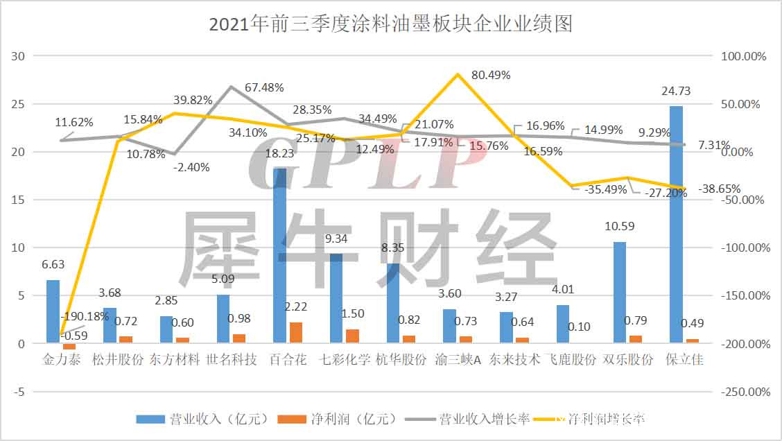 整體看,2021年前三季度,塗料油墨板塊企業營收均增長,然而金力泰、雙樂股份、保立佳等企業的淨利出現下滑。