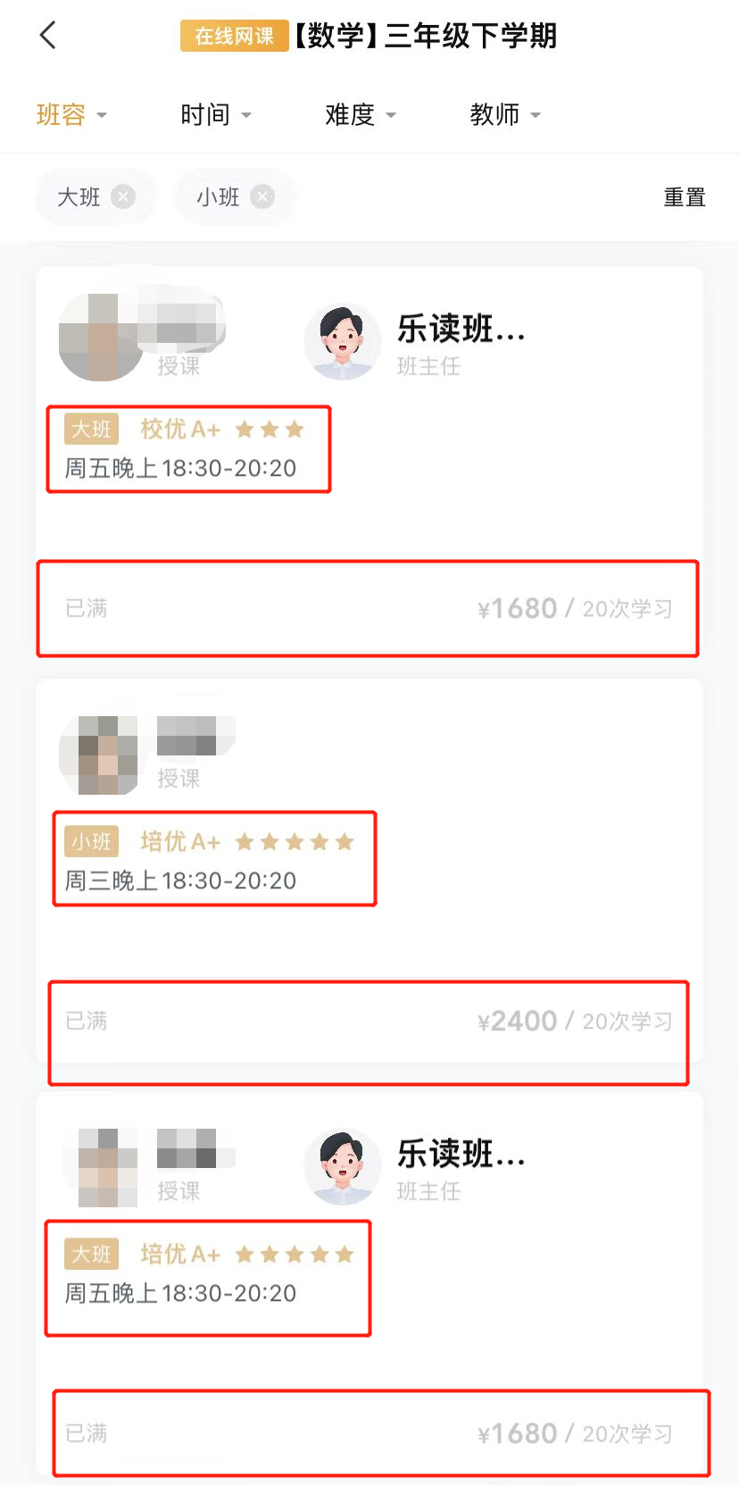 課程分為大小班兩個類型,小班35人,大班100人。根據人數不同,售價分別為1680元和2400元,每個價位包含20次課,有些年級還提供8次課的選擇。授課方式統一為線上授課,時間大多安排在晚上18:30到20:20,僅有少部分課程被安排在週四、週五下午16:20到18:10。線上課程分為 A、A+、S、S+ 4種,難度依次增加。