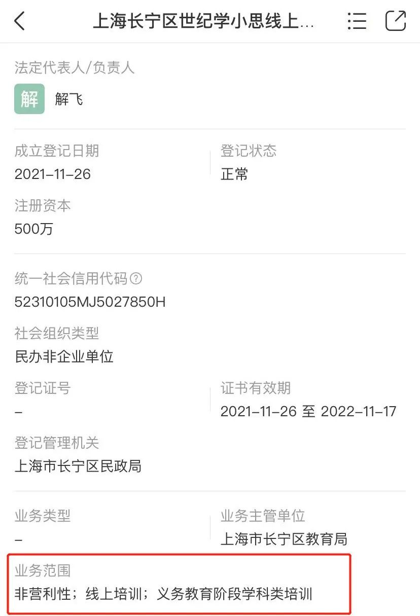 通過App的相關信息,《IT時報》記者發現,“樂讀優課”的開發商為上海長寧區世紀學小思線上教育培訓學校。天眼查的數據顯示,上海長寧區世紀學小思線上教育培訓學校成立登記日期為2021年11月26日,為民辦非企業單位。登記管理機關為上海市長寧區民政局,業務受上海市長寧區教育局主管,屬於非營利性機構。其業務範圍為線上培訓、義務教育階段學科類培訓。
