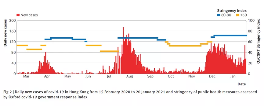 在公共衞生措施隨時間明顯波動的地區,也是觀察公共衞生措施效果的好機會。例如在中國香港,疫情的起伏與當地防控力度的高低幾乎完美一致(圖2)。[11]當防控措施放鬆時,疫情很快就跟着上升;相反,當防控措施加緊時,疫情很快就跟着回落。**還有研究顯示,防控新冠肺炎疫情的公共衞生措施同時也大大降低了同時期嚴重呼吸道感染和死亡的發生率。**這些證據進一步證明了公共衞生措施的有效性。[12—14]