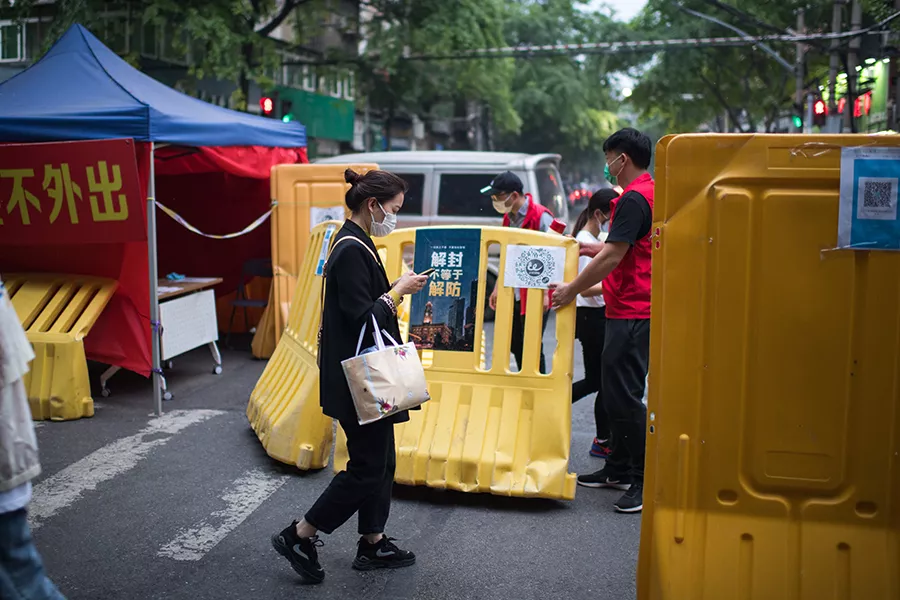 2020年4月16日,武漢市民在前進二路卡點掃健康碼出入小區。圖|新華社