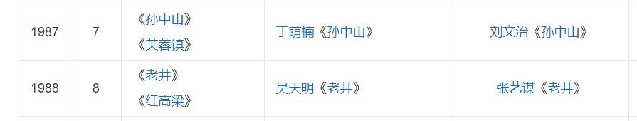 一定是那種特別好的電影才會有這種殊榮。那麼金雞獎歷史上有多少類似的場景呢?1987年和1988年,連續出現了金雞獎最佳電影、最佳導演和最佳男主角都集中的情形,電影《孫中山》和《老井》就獲得了這種榮耀。不過這兩年最佳電影都出現了雙黃蛋