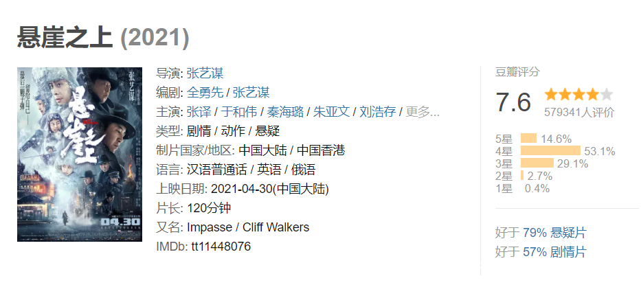 總而言之,今年金雞獎能挑出這些提名電影就不錯了,《懸崖之上》也確實是提名名單裏最出挑的那一個了。估計張藝謀拿最佳導演,同時《懸崖之上》拿最佳電影基本上是板上釘釘了。