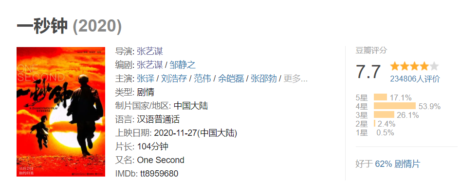 不過,張譯就更加可惜了。以他在《一秒鐘》裏的表現,拿個影帝綽綽有餘了。