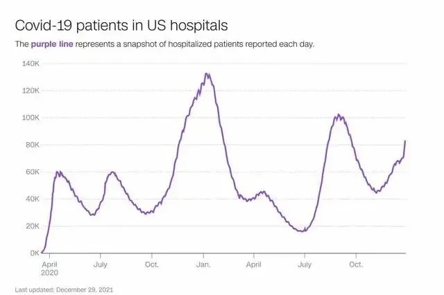根據美國衞生與公眾服務部的數據,在全美範圍內,近78%的ICU牀位正在使用,其中22%被新冠患者佔用。而因新冠住院的兒科人數僅比9月初的峯值低2.2%,自12月中旬以來持續快速增長。