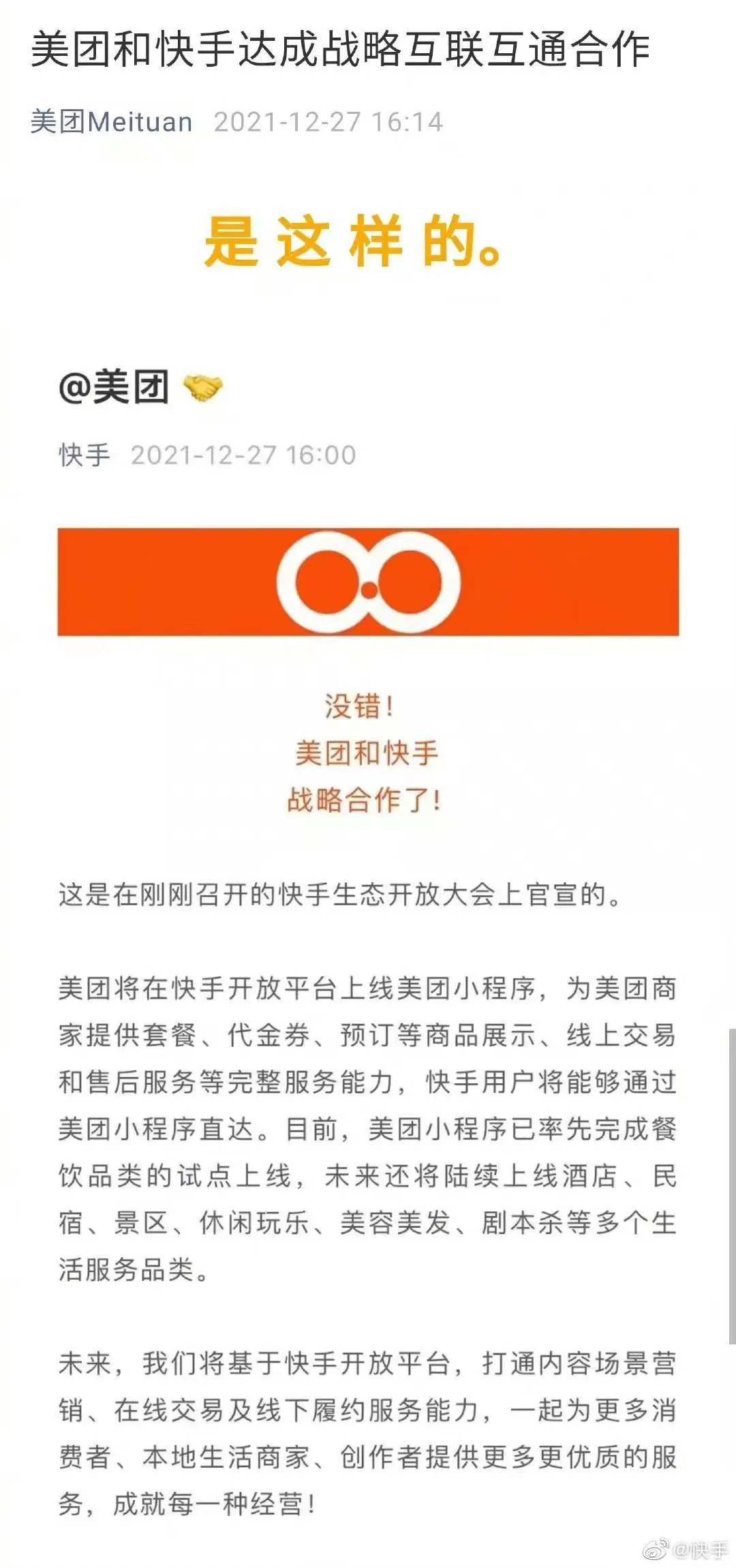 繼微信開放外鏈後,“互聯互通”又有了新一步進程。12月27日,快手與美團宣佈達成互聯互通戰略合作。雙方將基於快手開放平台,打通內容場景營銷、在線交易及線下履約服務能力,共同為用户創造“一站式”完整消費鏈路。
