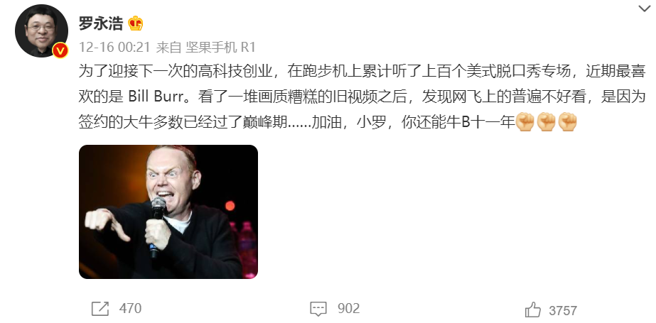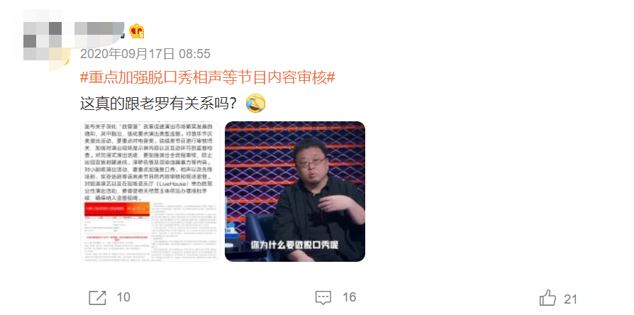 2020年,老羅參加的《脱口秀大會》火了,文旅部就開始“重點加強脱口秀相聲等節目內容審核”;