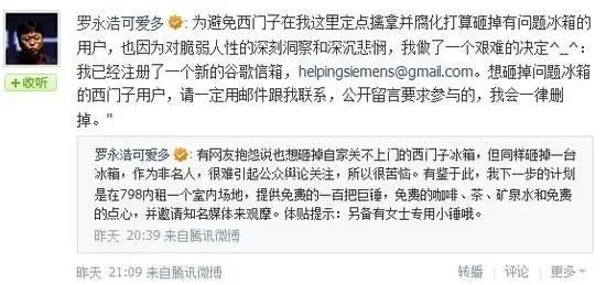 2011年9月,羅永浩連發幾條微博,説是家中先後購買的三台西門子冰箱都存在“門關不嚴”的問題,得到了眾多西門子用户的響應。