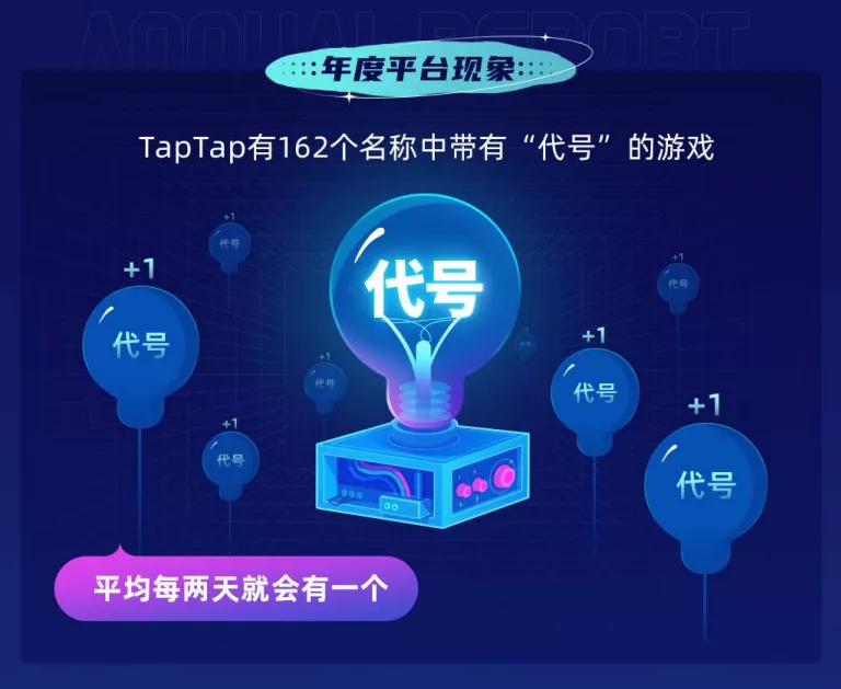 今年他們的年度報告中,同樣有一些有趣的數據。比如過去一年,平均每兩天,就會在TapTap上出現一個名稱中帶“代號”的遊戲,總計162個。這或許也是2021年最令人印象深刻的行業現象之一。