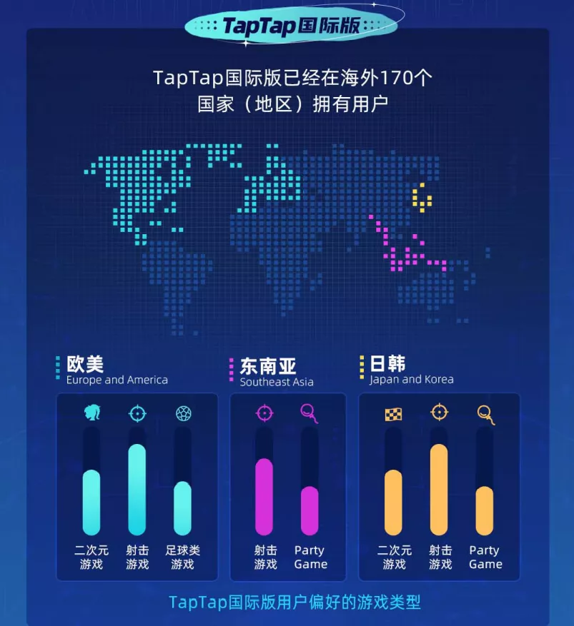 比較可惜的是,在今年的TapTap年度報告中,有關海外市場還沒有看到太多數據。我們僅看到TapTap國際版已在海外170個國家擁有用户,以及部分市場用户偏好的類型。