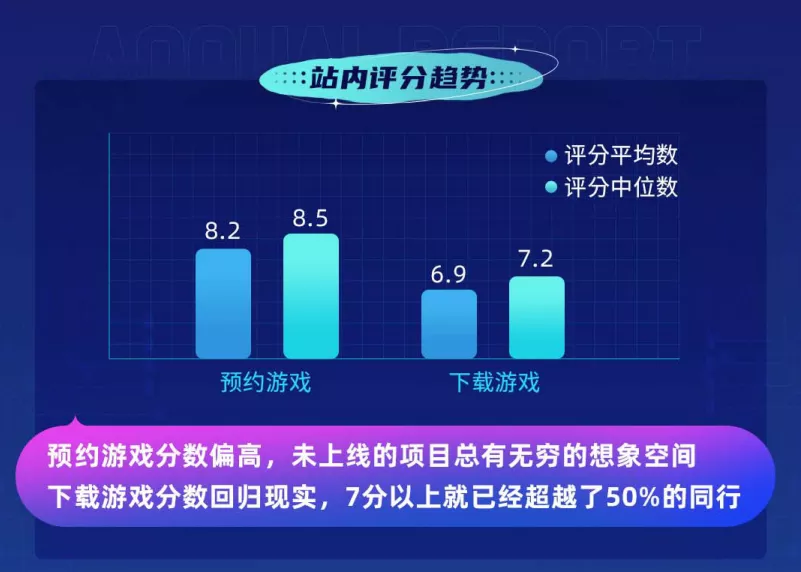 從短期來看,這一改動最直接的效果是提升了某些商業化遊戲的口碑。在當時,我也曾擔憂,時間一長是否出現大量遊戲評分趨同的現象,對比上沒有那麼鮮明,就像遊戲媒體愛打7分、8分。但從年度報告來看,TapTap目前仍是手遊評分中對比最鮮明的存在,評分達7分以上就超過了50%的同行,大量遊戲依然只有及格分,甚至不及格。