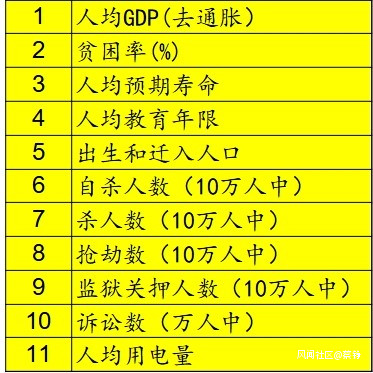 變量分正負兩類:人均GDP、人均用電量、人均預期壽命、人均教育年限和出生與遷入增加則得分,貧困率、自殺人數(10萬人中)、殺人數(10萬人中)、搶劫數(10萬人中)、監獄關押人數(10萬人中)和訴訟數(萬人中)增加則減分。