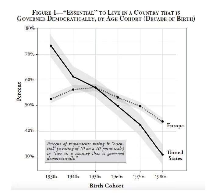問卷調查顯示,出生在1930年代的人,有74%認為“生活在民主國家是‘必要的’”,而1940年代、1950年代、1960年代、1970年代、1980年代的美國人分別只有62%、58%、50%、43%、31%。年齡越小,越沒有覺得民主是必要的。