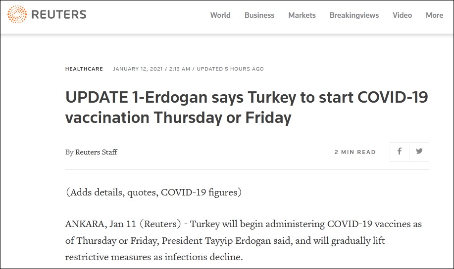 另據俄羅斯衞星網報道,埃爾多安這裏説的疫苗就是指前不久剛接收到的中國科興公司的疫苗:“土耳其在關注全球的疫苗生產。我們已經拿到了300萬劑中國疫苗。我希望週四或者週五就會啓動接種。”