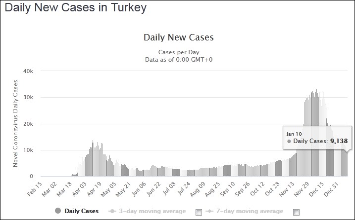 為了遏制第二波疫情,土耳其已經實行了為期一週的宵禁和為期一個多月的週末封鎖。從數據上看,這些措施已經取得了一定的效果。新年以來,土耳其日新增病例數從上月的2-3萬逐步下降到了9千。該國官員表示,如果這一趨勢能夠持續下去,土耳其將從2月起逐步放開限制,學校方面也已計劃復學。