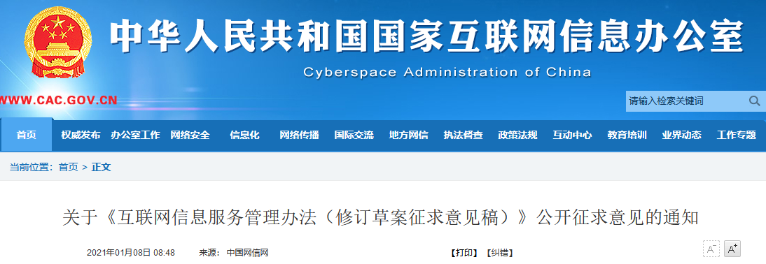 1月8日,國家網信辦會同工業和信息化部、公安部起草《互聯網信息服務管理辦法(修訂草案徵求意見稿)》(下稱:徵求意見稿)向社會公開徵求意見。