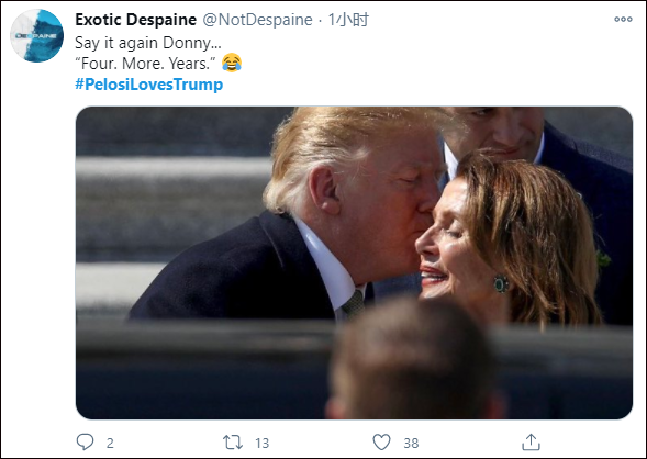 【文/觀察者網 齊倩】剛剛,推特出現了一條“神奇”的標籤——“佩洛西愛特朗普”(#PelosiLovesTrump)。該標籤甚至一度衝進推特美國區熱搜榜第十位,截至目前,已吸引用户發佈超30萬推文。