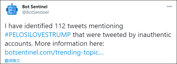 此外,一個名為“機器人哨兵”(@BotSentinel)的賬號曾在幾個小時前預警,**該系統注意到在“佩洛西愛特朗普”標籤內的100多條推文由“不真實賬號”發佈。**該賬號由一個用於檢測和跟蹤“政治和噴子機器人,以及不可信賬號”的免費平台所有。