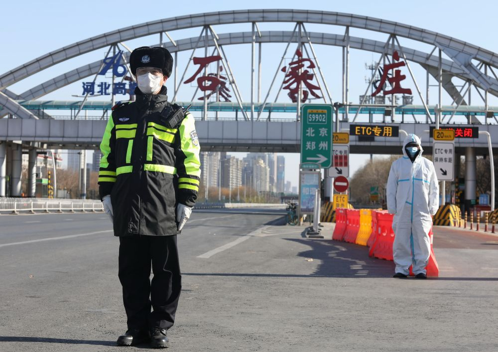 1月7日,石家莊市公安局交通管理局裕華東警務站民警在新元高速石家莊裕華路進出口執勤。圖|新華社