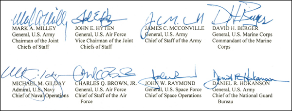 根據文件最後的落款,美軍參謀長聯席會議主席馬克·米利、副主席約翰·海騰及美國軍隊各軍種的領導人均簽署了這份聲明。