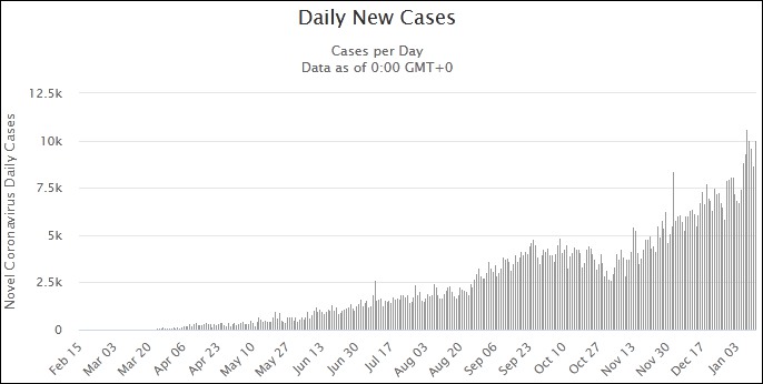 印尼官方數據顯示,截至1月12日,印度尼西亞相比前一天新增新冠肺炎確診病例10047例,累計確診達84萬6765例,累計死亡達24645例。其累計確診病例數在全球位列第20,累計死亡病例數在全球位列第17。
