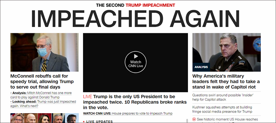 一時間,這一歷史性消息成為包括CNN、《紐約時報》、《華盛頓郵報》等各大美媒的頭版頭條:特朗普,再次被彈劾!