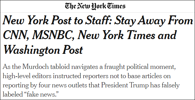 《紐約郵報》通知員工:今後不準引用四大“自由派媒體”的報道