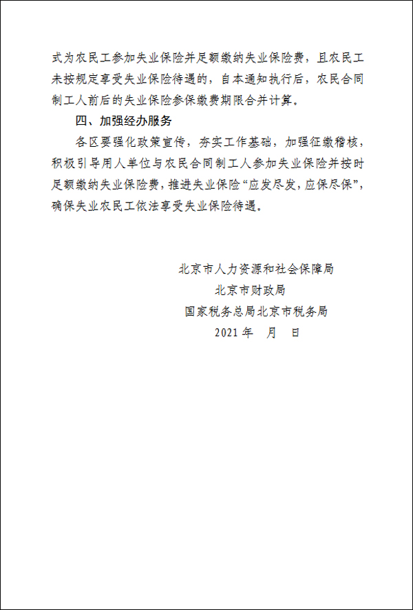 2021年5月1日前,用人單位按“農民合同制工人”方式為農民工參加失業保險並足額繳納失業保險費,且農民工未按規定享受失業保險待遇的,自本通知執行後,農民合同制工人前後的失業保險參保繳費期限合併計算。