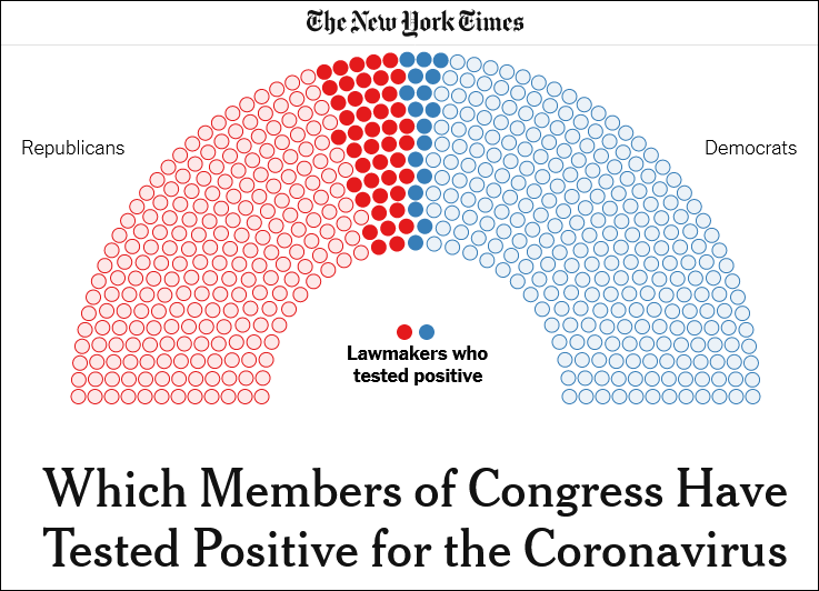 美國國會共有535名議員,其中眾議員有435名,參議員則有100人。自疫情發生以來,已有多達61名現任的國會議員新冠病毒檢測陽性,即超過十分之一的議員“中槍”(11.4%),且共和黨的44人明顯要多於民主黨的17人。