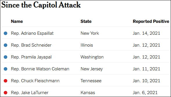 特別是自國會騷亂之後,已先後有6名兩黨國會眾議員新冠病毒檢測呈陽性。由於騷亂當天許多未戴口罩的示威者衝入國會,同時一些議員也未戴口罩,醫生認為他們早已曝露在了感染病毒的危險之中。