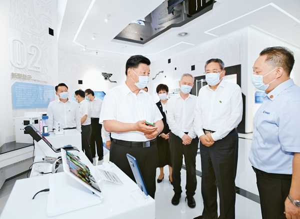 2020年8月18日至21日,中共中央總書記、國家主席、中央軍委主席習近平在安徽省考察。這是19日下午,習近平在合肥市安徽創新館參觀,瞭解安徽科技創新和發展新興產業情況。 新華社 燕雁/攝