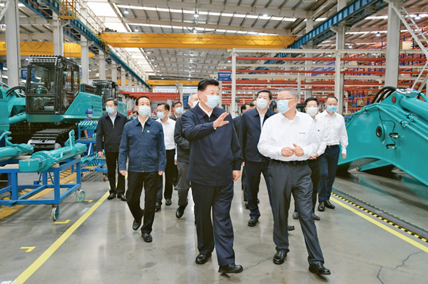 2020年9月16日至18日,中共中央總書記、國家主席、中央軍委主席習近平在湖南考察。這是17日下午,習近平在長沙市山河智能裝備股份有限公司生產車間,察看裝備製造流程,瞭解技術研發、生產製造情況。 新華社 李學仁/攝