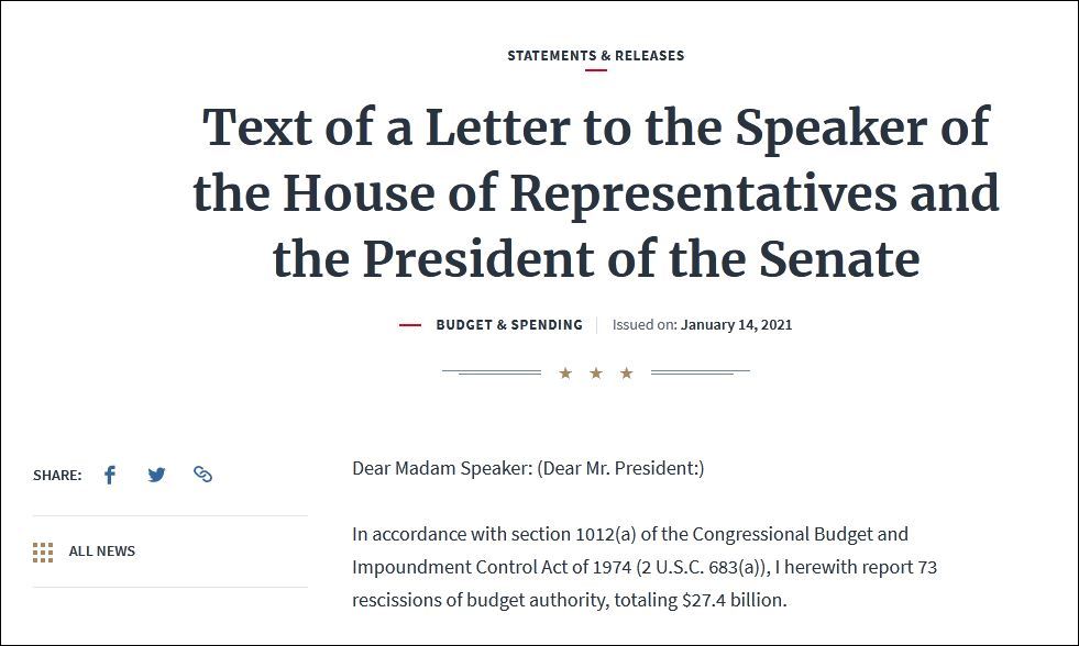 2020年12月,特朗普簽署了總額約9000億美元的經濟紓困法案和總額達1.4萬億美元的2021財年預算法案。不過當時他就表示,會向國會提出削減“浪費項目”的要求。