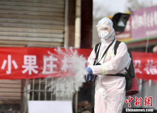 1月15日,石家莊消防救援支隊藁城大隊消防員在小果莊村村口路段消殺。 圖|中新網