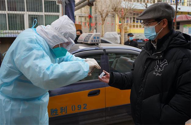 1月12日,在石家莊市裕華區金馬五社區,工作人員為接受核酸採樣的居民錄入信息。圖|新華社