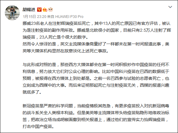 就在1月15日晚間,《環球時報》總編輯胡錫進在微博上發文,同樣提及了發生在挪威的這起疫苗事件,以及美英等西方媒體態度。