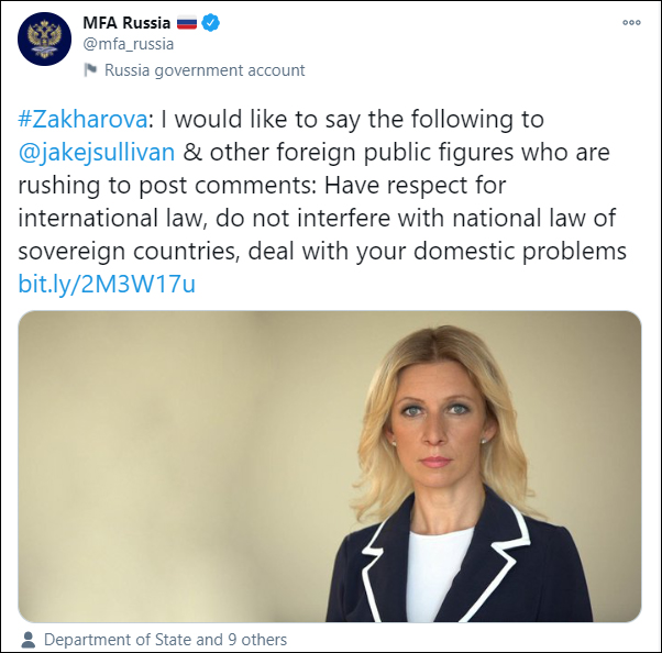 俄外交部發言人扎哈洛娃在推特上回應稱,“我希望告訴蘇利文與其他急於跳出來發表評論的人:尊重國際法,不要干涉主權國家的國內法,操心你們國內的問題。”