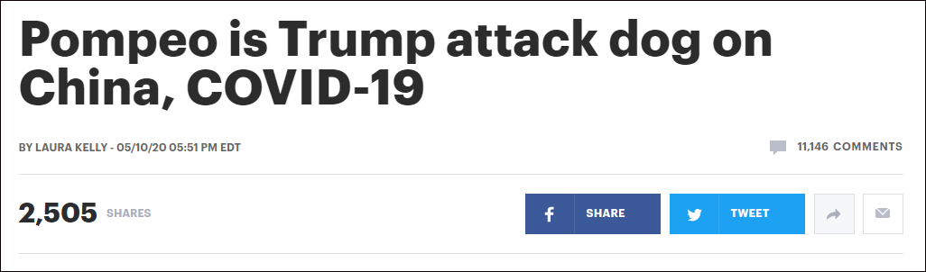 美國《國會山報》早在去年10月的一篇文章中就一語中的,直言蓬佩奧是“特朗普的攻擊犬”(attack dog)。民主黨參議員墨菲(Chris Murphy)認為,蓬佩奧此舉就是在玩弄政治遊戲,將中國視為一隻方便的“替罪羊”,以轉移美國民眾對於特朗普政府抗疫不力的注意力。