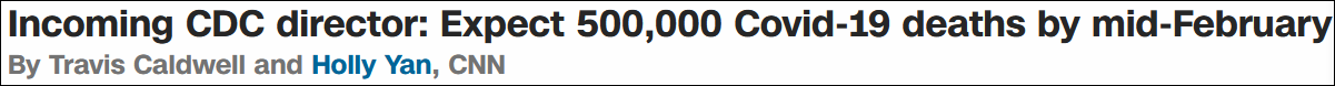 而特朗普政府的CDC主任羅伯特·雷德菲爾德(Robert R. Redfield)去年12月2日曾預測在2021年2月前,美國或有近45萬人死於新冠肺炎。