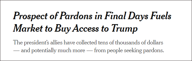 就在不久前,有美媒爆了一個大料。《紐約時報》在17日報道稱,隨着特朗普下台在即,越來越多的人試圖接近特朗普謀求赦免或減刑,以至於特朗普最後的赦免名額已經形成了利潤豐厚的“叫賣市場”。