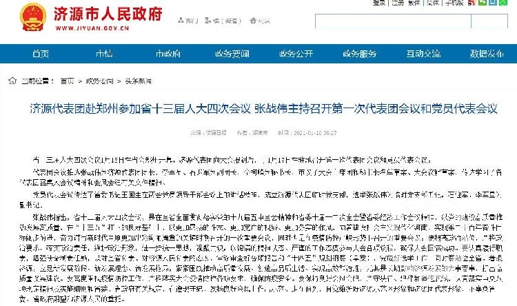 ▲1月18日,濟源日報報道顯示,河南省十三屆人大四次會議1月18日在省會鄭州開幕。濟源代表團會議推選張戰偉為團長。圖片來源/濟源市政府官網