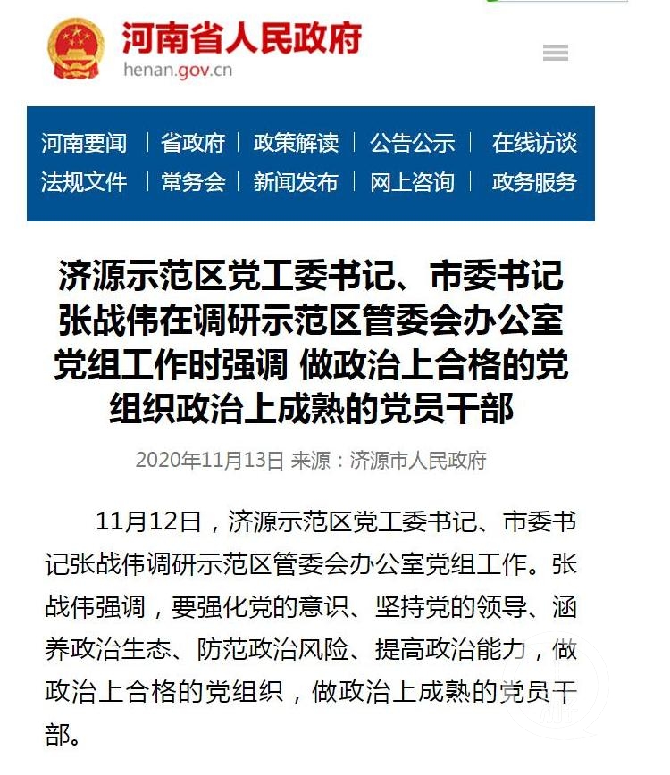 公開報道顯示,翟偉棟也是濟源示範區管委會辦公室主任。