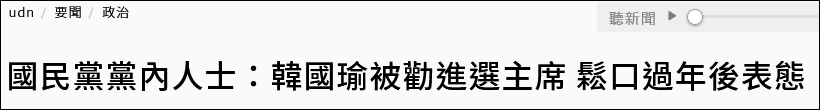 報道稱,國民黨黨內人士18日透露,已有前中常委“勸進”韓國瑜參選中國國民黨黨主席一職。雖然韓國瑜對此並未正面回應,但卻也“鬆口”,表示會在農曆新年過後正式表態。